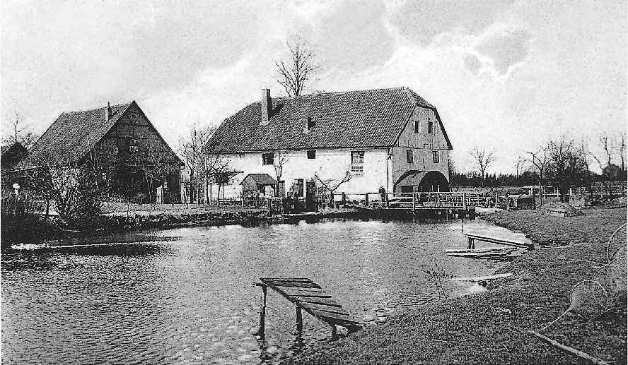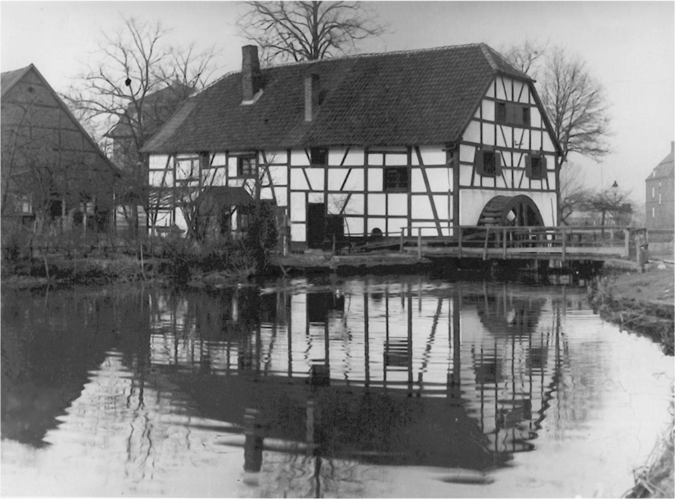 Wincks Korn-Mühle am Schölzbach, bereits im 16. Jahrhundert im Besitz der Stadt, war zunächst eine Papiermühle gewesen. Sie kam 1863 in den Besitz der Familie Winck. Im November 1900 stürzte der Müller Fritz Winck in den Mühlenbach und ertrank, als er das Schütt aufziehen wollte. Bild aus dem Dorsten Lexikon: Wincks Mühle bei Hochwasser 1953