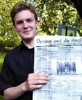 Kai Kreutzberger, Mitglied der Geschichts-AG des Gymnasiums, zeigt, was er gefunden hat. Das genaue Datum der Hebung des Findlings war lange unbekannt. „1934!“ sagte er.
