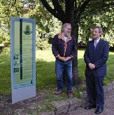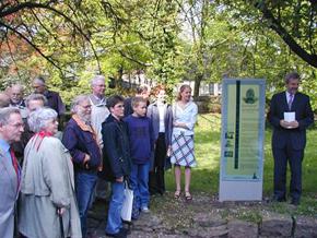Im Bild auch Stadtarchivarin Christa Setzer. Sie hatte – zusammen mit Josef Ulfkotte – das Interesse durch einen Beitrag im Heimatkalender 2002 auf den Findling im Westgraben gelenkt.