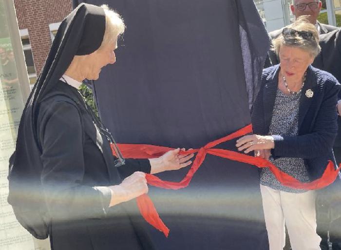 Schwester Marianne Kamlage, Provinzrätin aus dem Mutterhaus Münster-St. Mauritz, enthüllte gemeinsam mit Ursula Ansorge die Geschichtsstation.