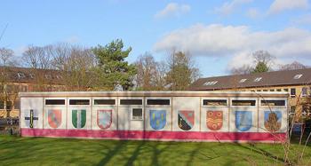 An der Südseite des Pavillion der Matthäus-Schule sind die Wappen der ehem. Gemeinden der Herrlichkeit, des Amtes Hervest-Dorsten und der Stadt Dorsten.
