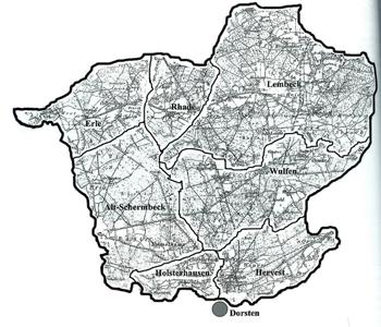 Die bis 1975 gültigen Grenzen der 7 Gemeinden der Herrlichkeit Lembeck, bzw. der Ämter Lembeck und Altschermbeck, bzw. des Amtes Hervest-Dorsten (bis 1929 ohne Dorsten).