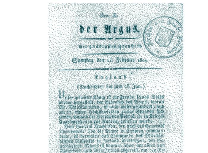 Der Dorstener Buchhändler und Buchbinder Karl August Schüerholz (1775 - 1831) verlegt die Zeitung „Argus, von politischen, gemeinnützigen und gelehrten Sachen". | |