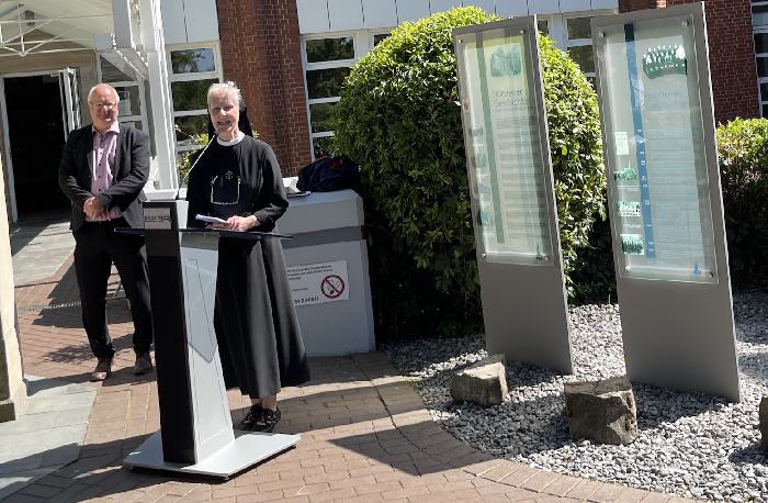Schwester Marianne Kamlage, Provinzrätin aus dem Mutterhaus Münster-St. Mauritz, enthüllte gemeinsam mit Ursula Ansorge die Geschichtsstation. Mathias Feller, Vorsitzender des Aufsichtsrates des Elisabeth-Krankenhauses, dankte den Franziskanerinnen mit den Worten: "Das Motto 'Medizin mit Menschlichkeit' unseres Krankenhauses haben die Ordensschwestern bis zum Schluss lebendig vorgelebt."