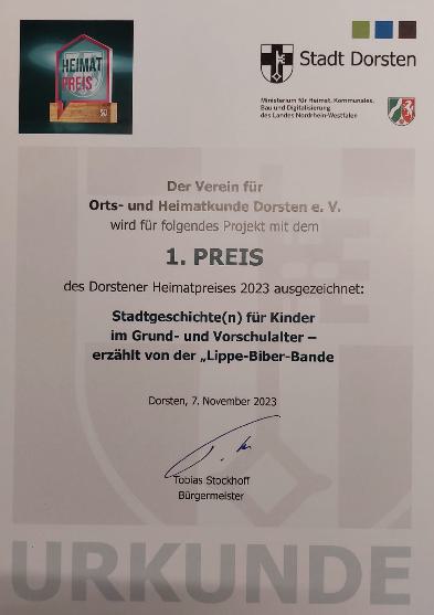 Denn mit ihrer Buch-Reihe „Lippe-Biber-Bande“ hat das Kreativ-Duo den ersten Platz bei der Premiere des mit insgesamt 5000 Euro dotierten und von einer Jury bestimmten „Heimatpreises“ der Stadt Dorsten belegt und ist damit direkt in die nächste Runde für den „Landes-Heimatpreis“ aufgenommen worden.