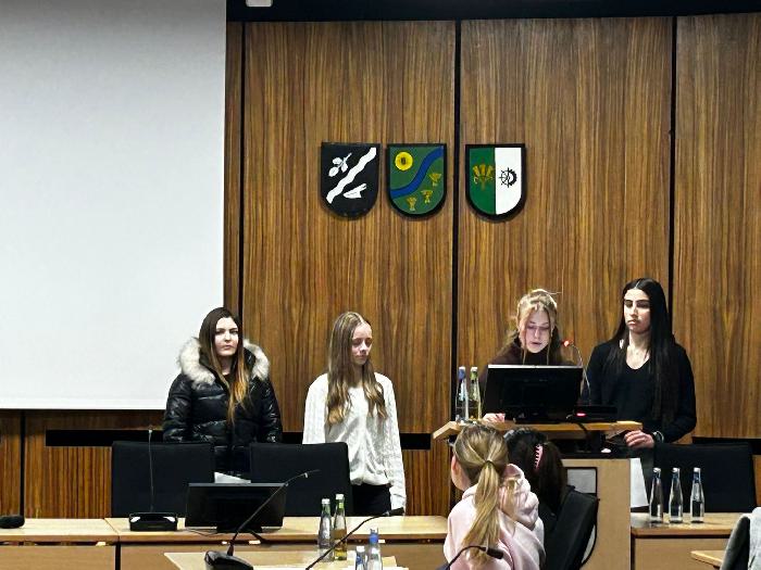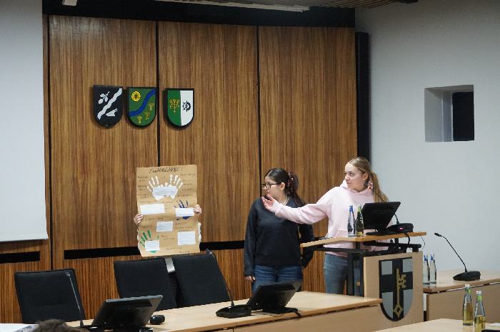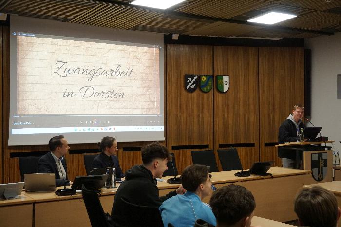 Am 23. November 2025 fand auf dem sogenannten „Russenfriedhof“ in Dorsten-Holsterhausen eine eindrucksvolle Gedenkveranstaltung für die während des Zweiten Weltkriegs in Dorsten verstorbenen sowjetischen Kriegsgefangenen und Zwangsarbeiter statt. Maßgeblich gestaltet wurde sie von Schülerinnen und Schülern der Klassen 10a und 10b des Gymnasium Petrinum. Unter Begleitung des Historikers Dr. Marius Seydel vom Volksbund Deutsche Kriegsgräberfürsorge hatten sie sich in einem Projekt intensiv mit den Schicksalen dieser Menschen beschäftigt und stellten ihre Ergebnisse vor Ort vor. Bild: Im Beisein von drei Schülern der Klasse 10b des Gymnasium Petrinum, der stellvertretenden Landrätin Martina Eißing (CDU) und Dr. Josef Ulfkotte (Verein für Orts- und Heimatkunde) übergaben Dr. Marius Seydel (r.) und Stefan Schmidt vom Volksbund Deutsche Kriegsgräberfürsorge die neu erstellte Liste der auf dem Waldfriedhof, dem „Russenfriedhof“ in Dorsten-Holsterhausen und dem Kommunalfriedhof in Dorsten-Hervest bestatteten sowjetischen Kriegsgefangenen an Bürgermeister Tobias Stockhoff.